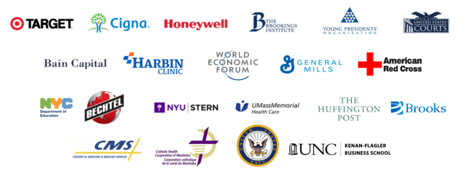 学院的客户包括在世界上深具影响力的公司和组织,比如:世界经济论坛、英特尔、塔吉特连锁、赫芬顿邮报、宝洁、贝恩资本、通用磨坊、纽约大学斯特恩商学院、美联邦法院系统、美国红十字协会、嘉吉、信诺、Chase国际、梅奥医学中心、杜克大学等。